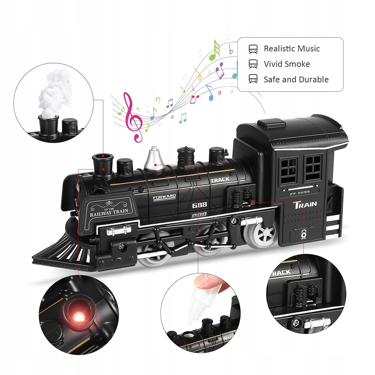 - Во время движения локомотив издает реалистичные звуки , спереди загорается диод, и из трубы идет дым