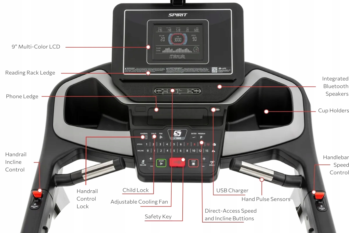 Большинство беговых дорожек Spirit Fitness имеют несколько способов регулировки скорости и наклона. В каждую консоль встроены кнопки для регулировки скорости и изменения угла подъема. В распоряжении пользователя имеются кнопки быстрого выбора или стандартные кнопки + и –. Скорость также можно регулировать с помощью кнопки +/-, расположенной на правой ручке руля. Левая ручка позволяет изменять наклон. На консоли даже есть кнопка, позволяющая отключить кнопки руля.