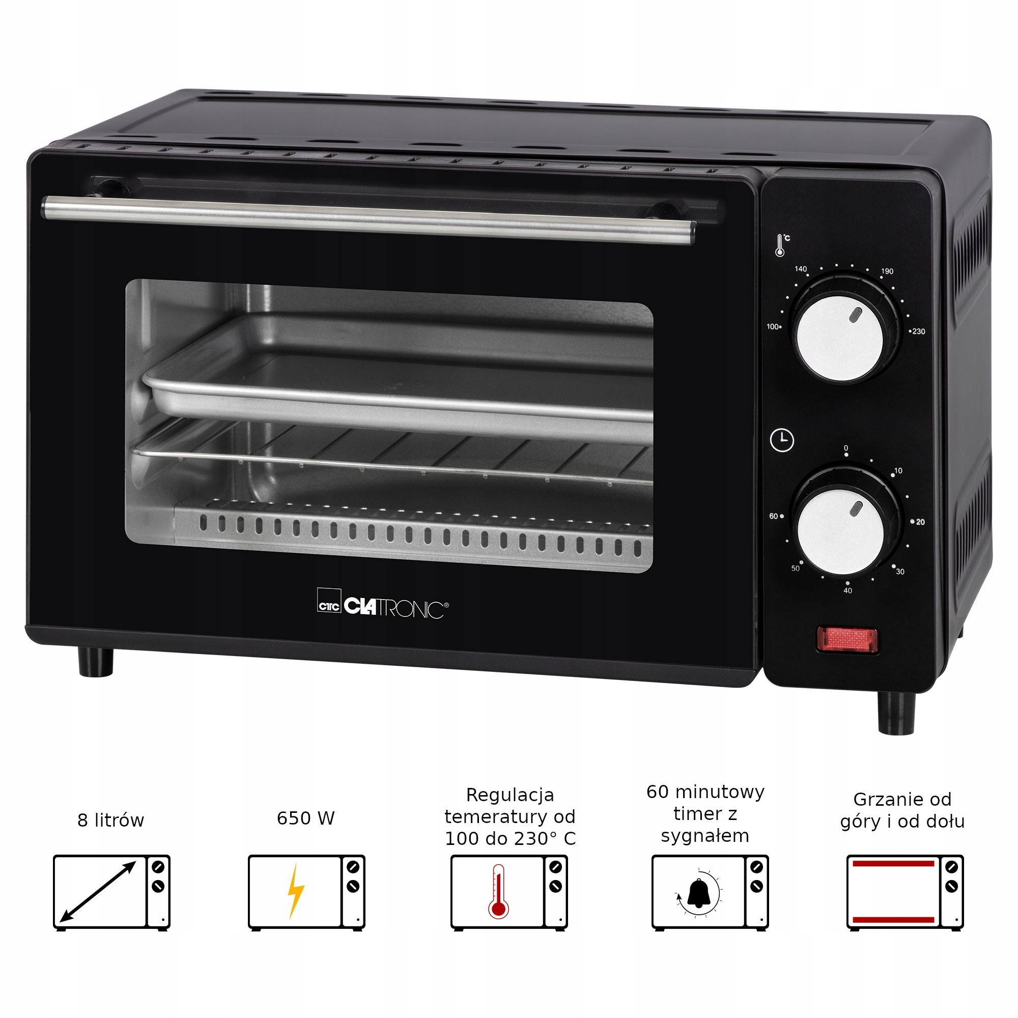 Мини-духовка электрическая мощностью большой духовки идеальна для офисных условий, в гостевом доме или квартире-студии. Запекайте курицу-гриль, жаркое, рыбу, запеканку, пиццу или картофель фри. В вашем распоряжении тарелки, решетки и решетка, которые легко содержать в чистоте. Нагревательные элементы, установленные сверху и снизу, достигают температуры от 100 до 230°C. Духовка имеет объем 8 литров и мощность 650 Вт.