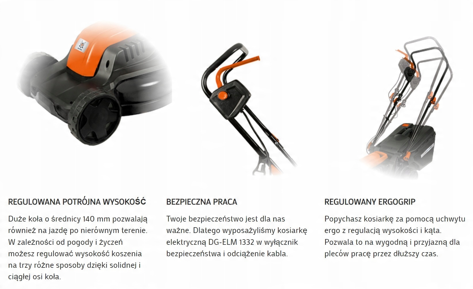 Красивая зелень вокруг дома – мечта каждого. Он не только украсит наше окружение, но и позволит вам расслабиться, не выходя из собственного сада. Чтобы трава была густой, ярко окрашенной и жизнеспособной, мы должны регулярно ее косить. Электрическая газонокосилка DG-ELM 1332 с шириной стрижки 32 см подходит для стрижки домашних газонов.