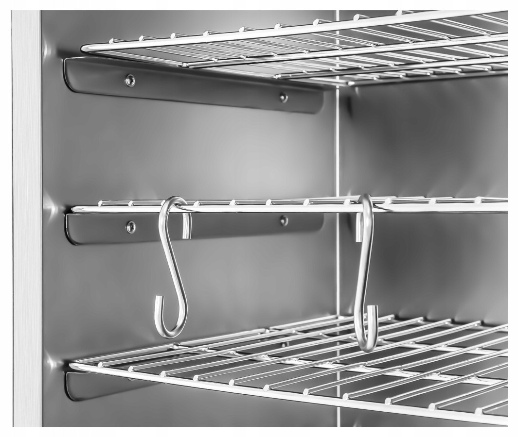 Электрическая коптильня Royal Catering — это устройство, используемое в барах, ресторанах, гостиницах, гостиницах, агротуристических фермах и домашних фермах. С ее помощью можно готовить копченые сыры, мясо, рыбу и т. д. Модель RCRO 870 оснащена нагревательным элементом мощностью 1000 Вт и эффективным термостатом, поддерживающим температуру в диапазоне от 0 до 110°С. В результате можно использовать следующие способы копчения: горячее (52 - 80°С) и одновременное запекание (свыше 82°С).