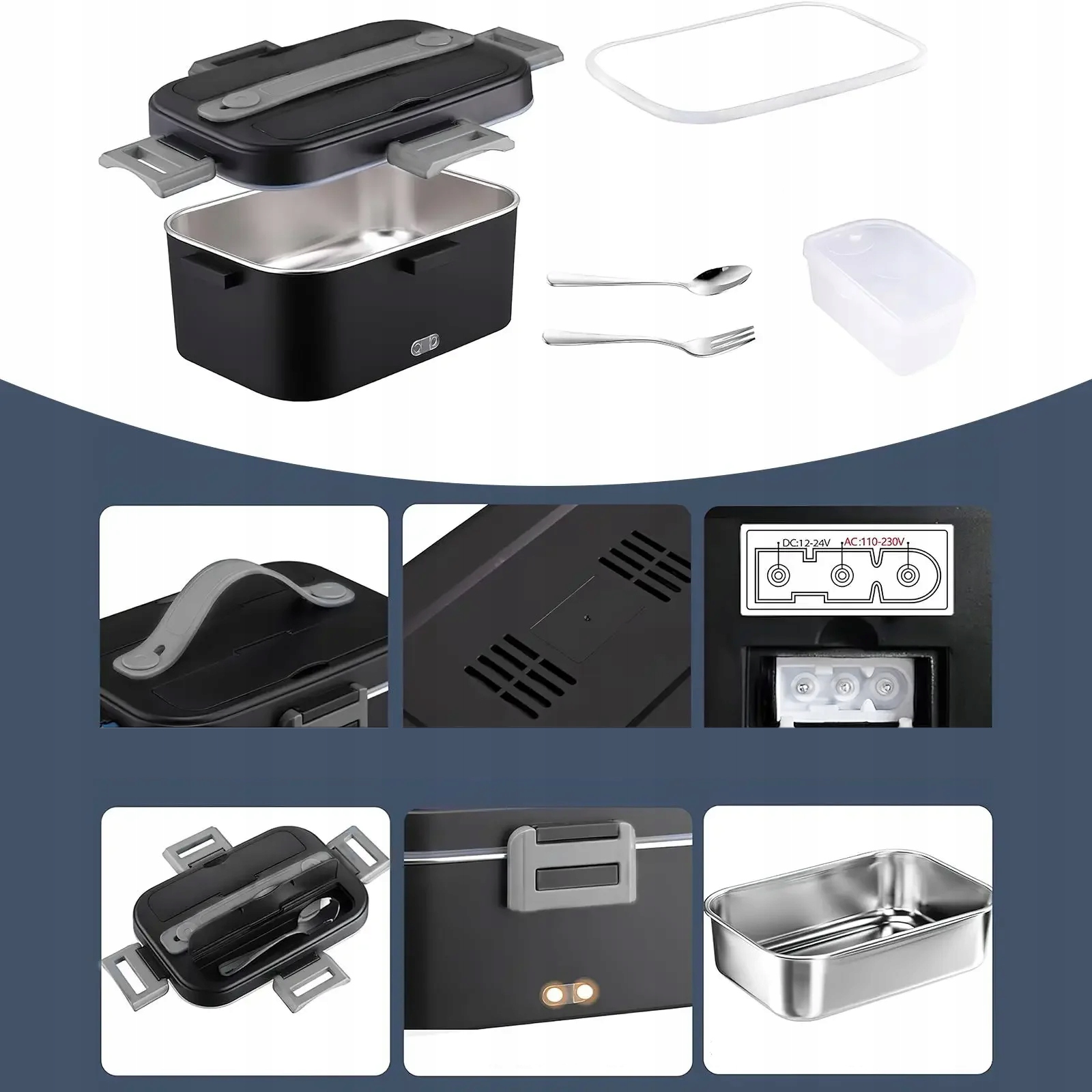 V/24 В для кабеля питания для дома/грузовика и 55 Вт-12 В для автомобильного кабеля. Автомобили и дома имеют различные методы отопления, что делает их более безопасными. Подходит для такси/пикников/офисов/студентов. (При использовании коробки для обеда используйте пробку -IN с соответствующим напряжением.) В этой плотной коробке с емкостью 0,45 л и двухэтажным набором столовых приборов из нержавеющей стали (вилка/ложка). Легко чистить. Предотвратить переполнение.