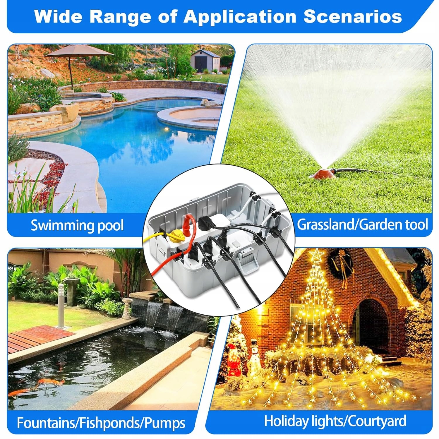 - 2 способа использования, легкая установка: 1. можно установить горизонтально на плоской поверхности; 2. На задней водонепроницаемой коробке есть два отверстия, которые можно использовать для подвешивания. Легко в использовании: просто поместите кабель подключения в водонепроницаемый корпус, прикрепите кабель зажимом, оберните его резиновой лентой, а затем накройте водонепроницаемый корпус. Ландшафт, бассейны, фонтаны, рыбные пруды, террасовые обогреватели, гидромассажные ванны, кондиционеры, камеры безопасности и многие другие.