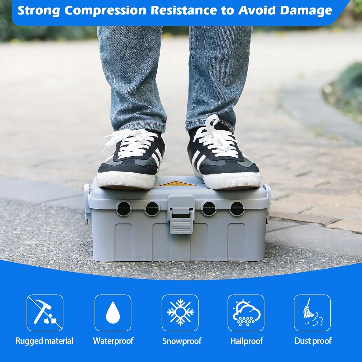 - Водостойкость IP54 и долговечность: изготовлен из прочного, армированного полипропилена, является водонепроницаемым в соответствии со стандартом IP54, тестируемым при высокой температуре и при замерзании до -40 ℃, выдерживает вес до 300 фунтов. Устойчив к дождю, воде, снегу, пыли, грязи и другим факторам. Постоянно защищает внешние соединения от электрических угроз.