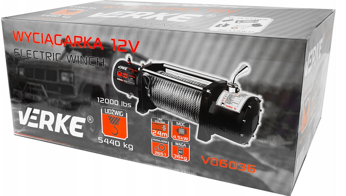 12 В лебедка, 12000 фунтов, стальная лина 24m Verke h1>