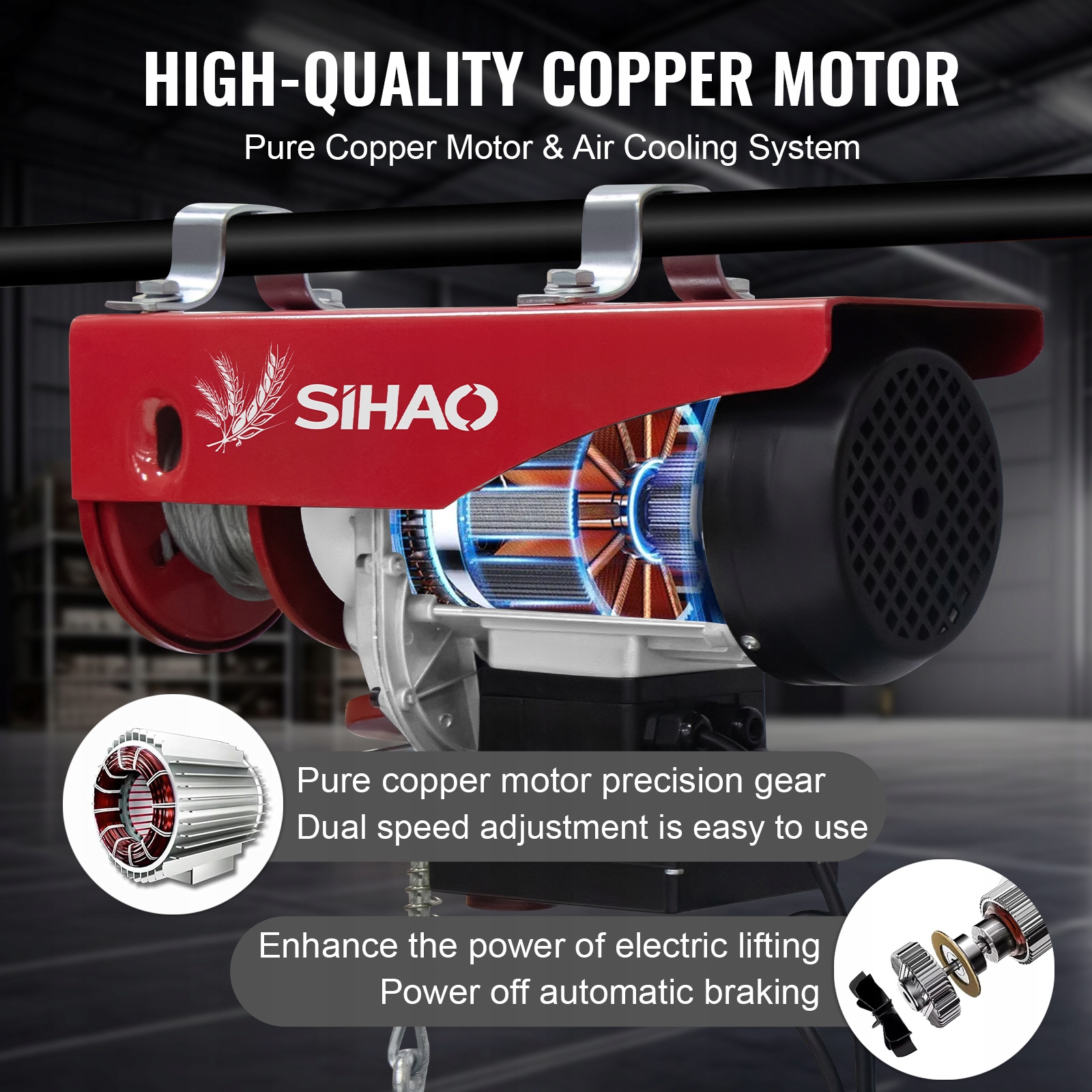 Мощный двигатель из меди:Высококачественный двигатель из чистой меди с эффективной системой воздушного охлаждения обеспечивает высокую производительность, двухскоростное регулирование и автоматическое торможение при выключении.