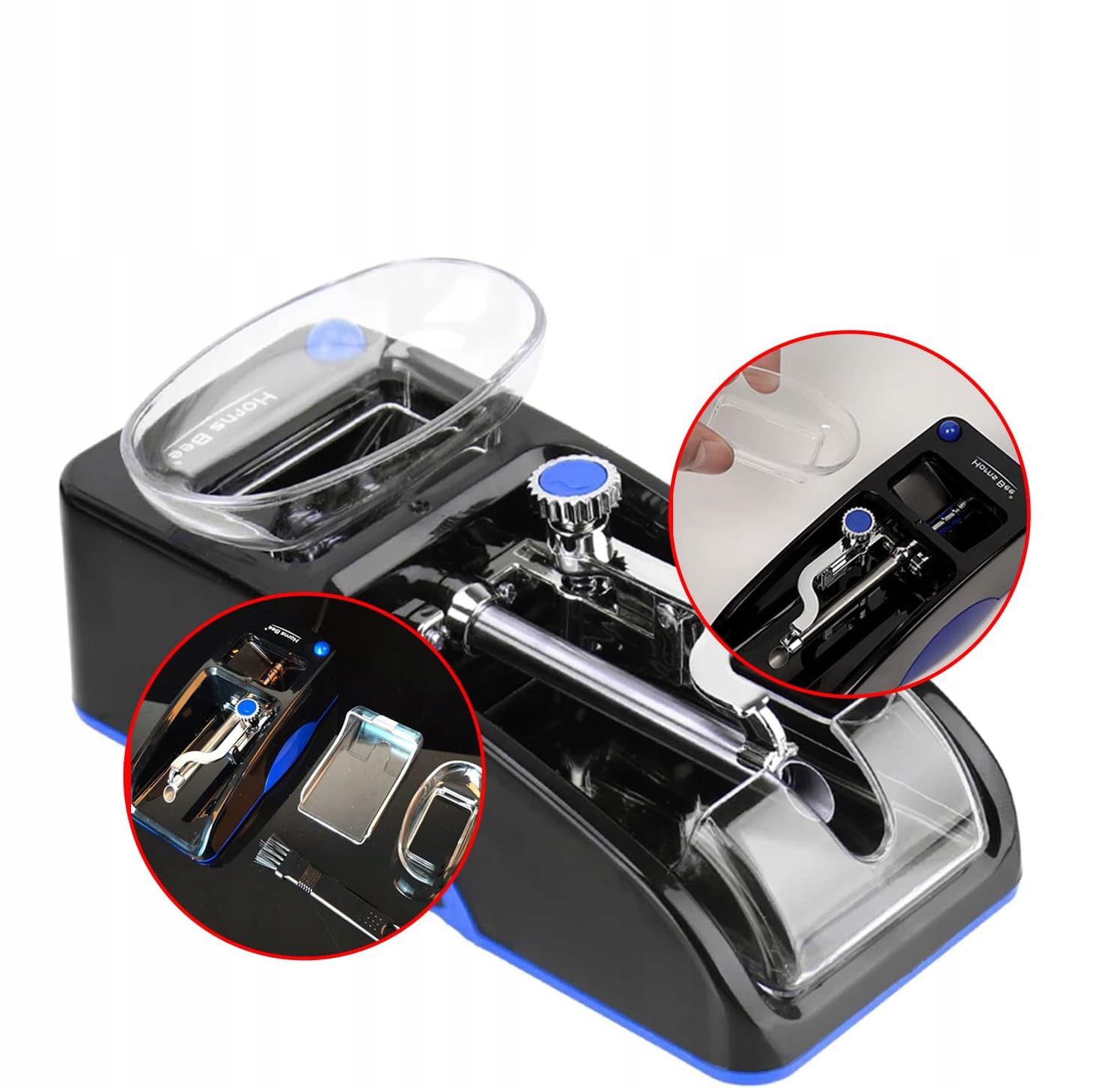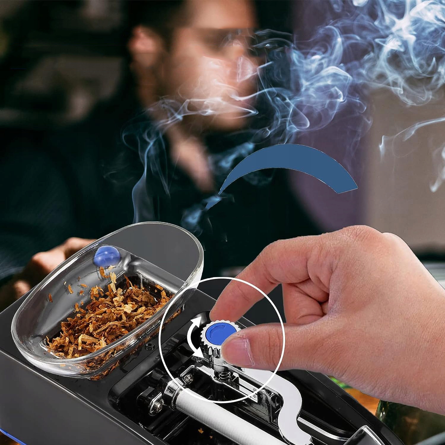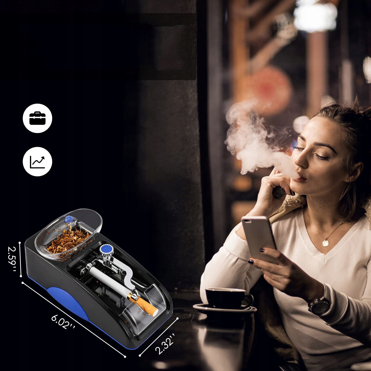 🚬🚬 Регулируемый переключатель: Красивая электрическая машина для скручивания сигарет с интересным дизайном и вращающимися синими шестернами для регулирования плотности табака в соответствии с вашими собственными предпочтениями. Небольшой размер (15,3 х 5,9 х 6,6 см), легко носить, вы можете сделать свои собственные сигареты в любом месте. Портативный, простой в использовании и чистоте. Это компактное устройство является прибыльным и может помочь в производстве сигарет и обеспечить приятный опыт жизни.