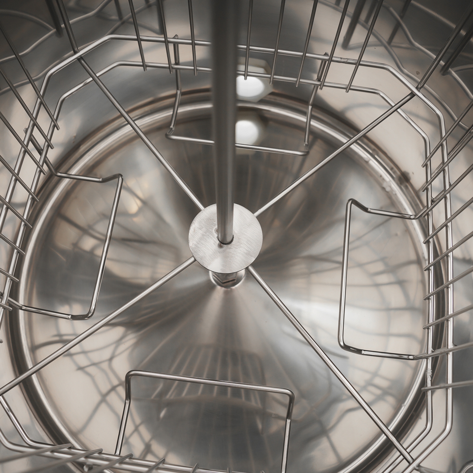 Здоровый и гигиеничный: закрытая шестерня на рамке не загрязняет мед. Зашифрованная внутренняя корзина полуподвешена, чтобы избежать впитывания извлеченного меда в металл, что более полезно для здоровья.