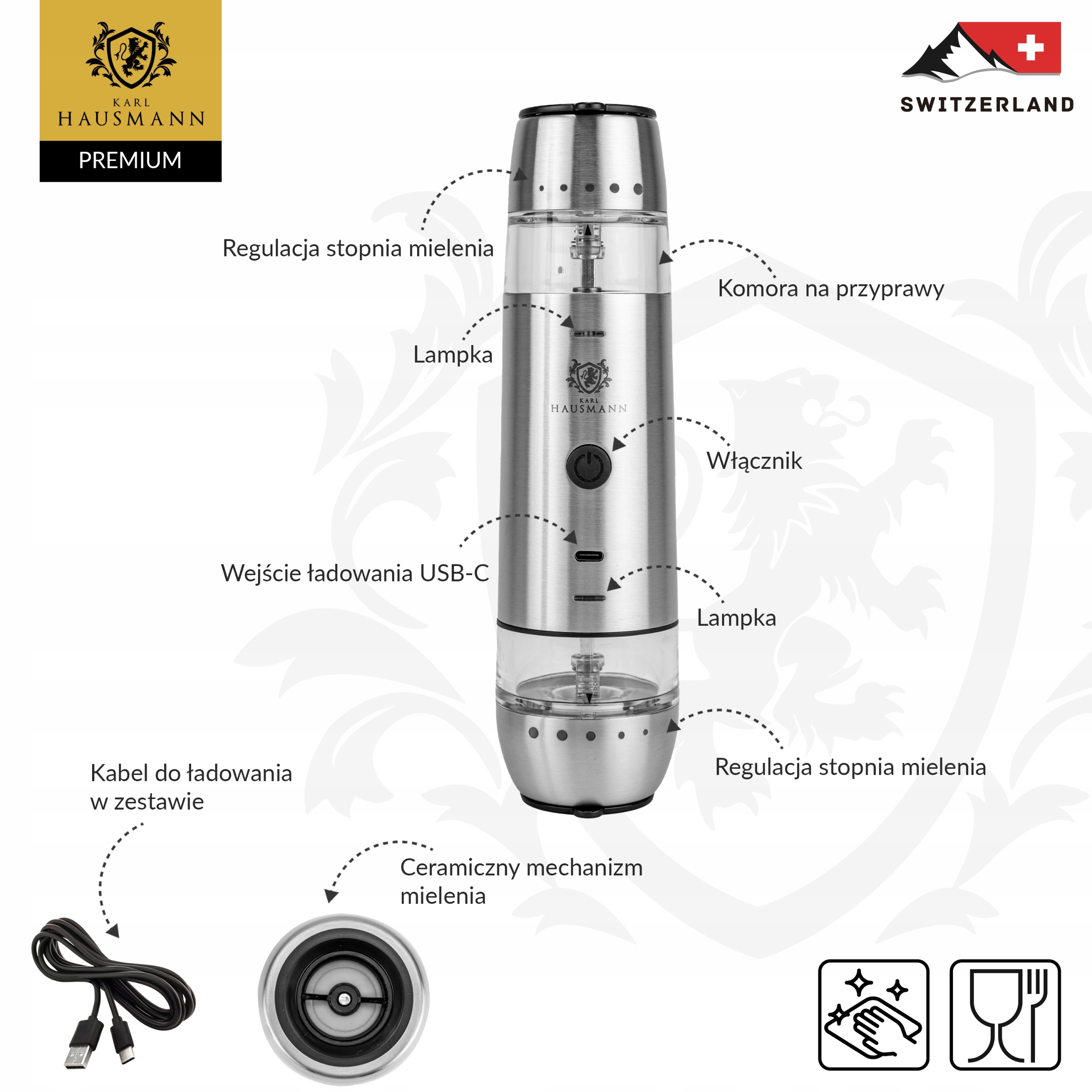 Электрическая мельница для специй от Карла Хаусмана — это практичный и современный прибор, b>улучшающий Повседневная кулинария. Оснащенная светодиодом, кофемолка информирует о своей работе, что позволяет легко проверить, есть ли в данный момент молотые специи. Благодаря 5-ступенчатой регулировке помола вы можете точно регулировать толщину специй в соответствии с вашими потребностями - от мелкого порошка до крупного. молотые зерна. Встроенный литий-ионный аккумулятор емкостью 750 мАч обеспечивает длительное время работы и исключает необходимость использования традиционных аккумуляторов, что снижает эксплуатационные расходы.