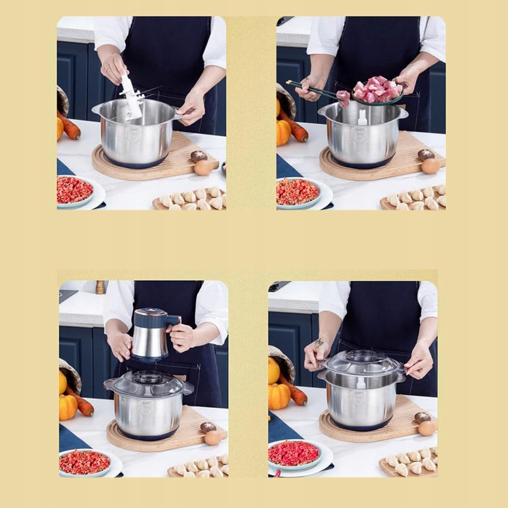 ➡5 скорости h2> - Электрический кухонный измельчитель имеет две скорости. Низкая скорость подходит для обрезки овощей, фруктов, чеснока, перца чили и т. Д.; Высокая скорость подходит для резки мяса, ветчины, моркови и т. Д.