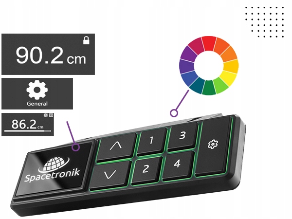 Электрически регулируемая рама Spacetronik SPE-231OB оснащена контроллером с удобствами. Вносите изменения, сохраняйте настройки на четком OLED-дисплее. Отрегулируйте высоту с помощью кнопок «вверх» и «вниз» и наблюдайте за текущим положением на OLED-экране. Сохраните до четырех выбранных настроек высоты и используйте их в будущем. Стол позволяет заблокировать контроллер, например, от несанкционированного использования детьми. Пространство вокруг кнопок подсвечивается попеременно несколькими цветами.