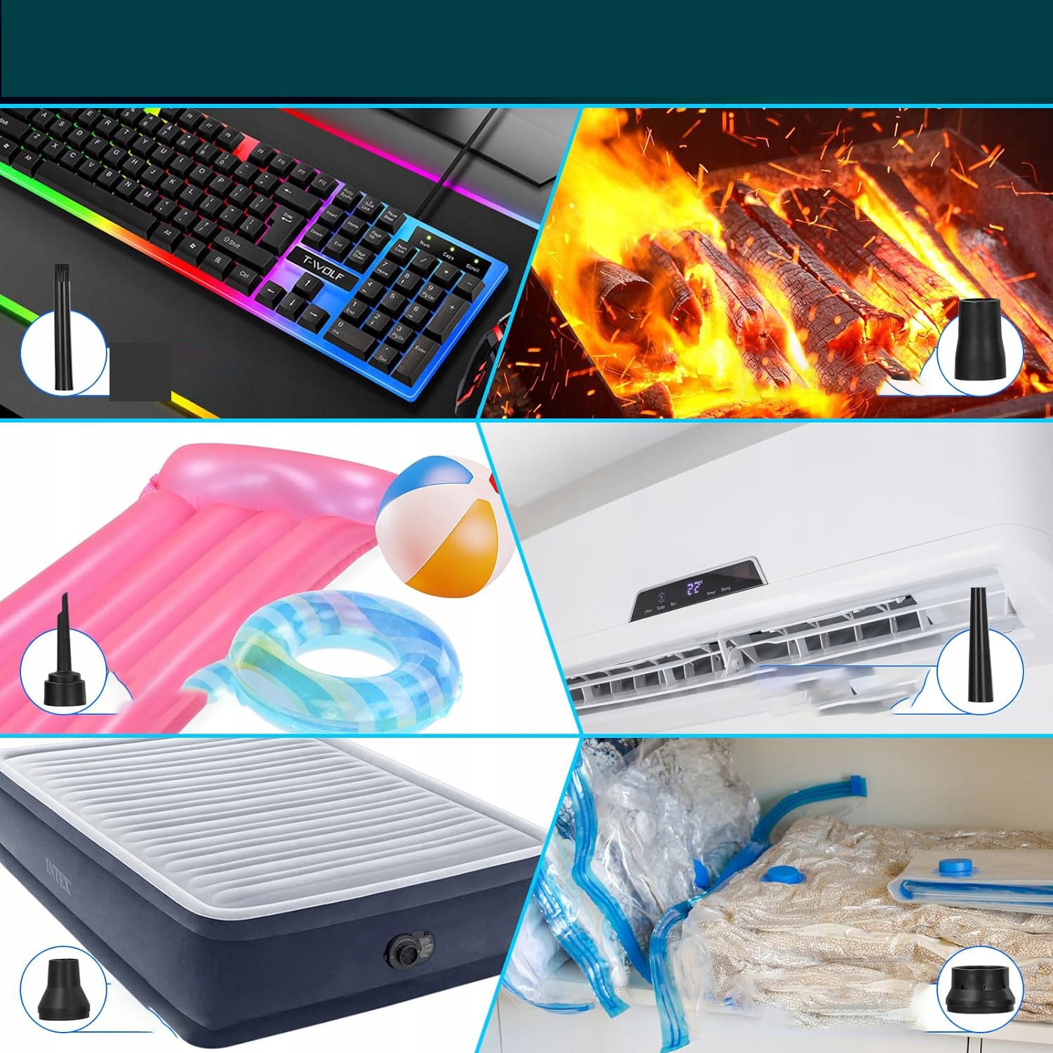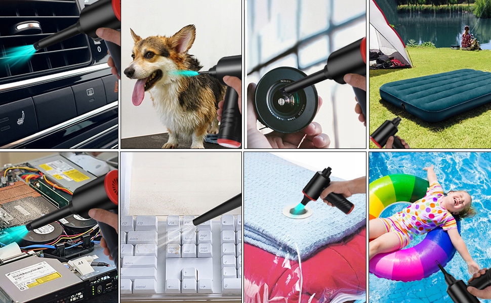 - Помимо пылесоса для корпусов компьютеров, клавиатур, салонов автомобилей, окон с геральдическими лилиями и многого другого, вы также можете использовать его с другими многофункциональными надувными приспособлениями, такими как кольца для плавания, надувные матрасы, надувные подушки. , вакуумные подушки безопасности, мячи для йоги и надувные игрушки.