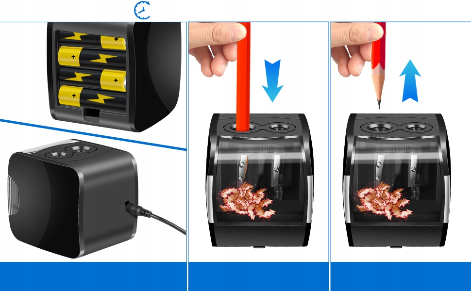 Наш электрический бланк может быть включен с помощью USB -кабеля или 4 батареи AA (не входит в комплект), поэтому вам не нужно беспокоиться о разряде. Примечание. Чтобы обеспечить достаточную мощность заточки, мы рекомендуем использовать USB -кабель
