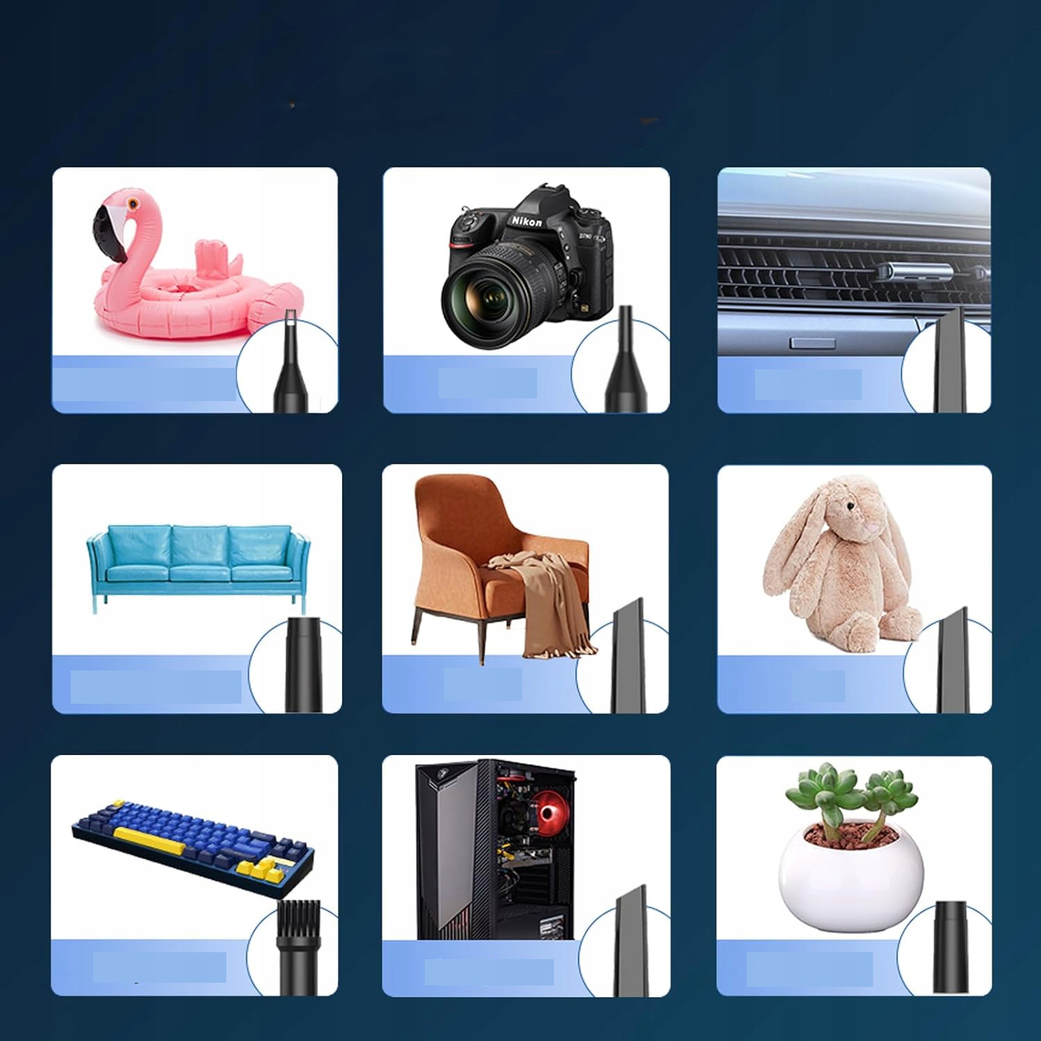 Его портативность и многофункциональность делают его идеальным для чистки электроники, салона автомобиля, клавиатуры и других небольших поверхностей, до которых трудно добраться традиционными чистящими средствами.