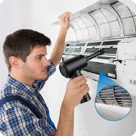 Портативная воздуходувка — это устройство, которое поможет очистить труднодоступные места, например клавиатуры, вентиляторы, электронное оборудование и мебельные уголки.