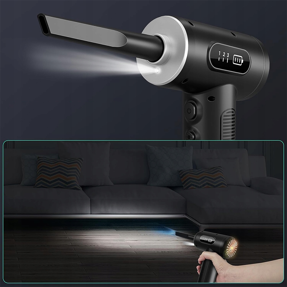 Наши пылесборники сжатого воздуха оснащены цифровым дисплеем, с помощью которого вы можете четко узнать уровень скорости воздуха и заряд батареи пылесборника. Этот очиститель сжатого воздуха для ПК также оснащен защитой аккумулятора. Будьте осторожны, не используйте пылесос во время зарядки и не заряжайте пылесос сразу после его использования, поскольку температура аккумулятора слишком высока. Перед зарядкой дайте ему остыть в течение 10 минут.