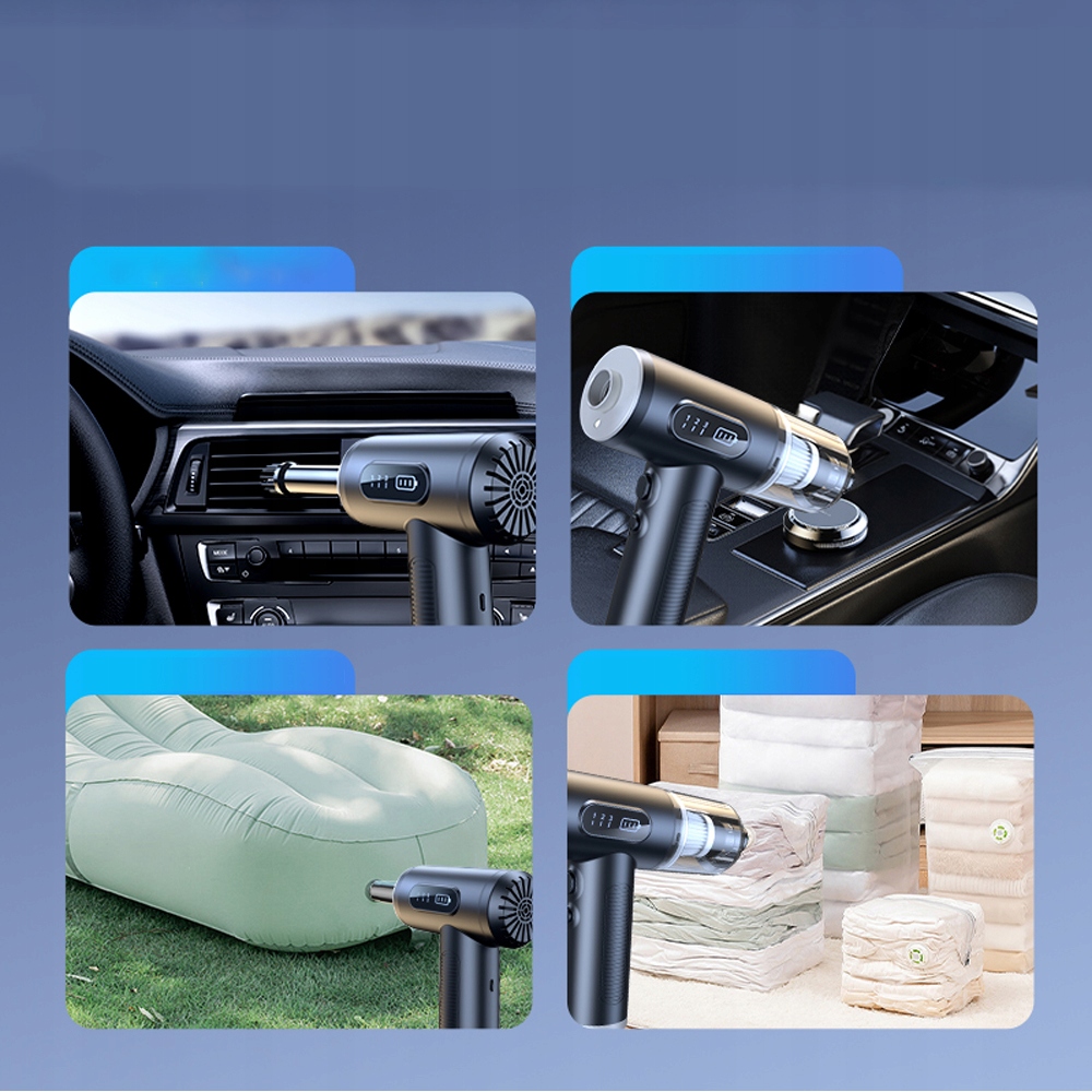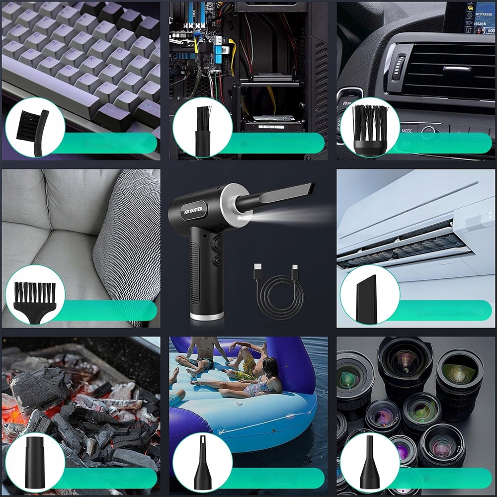 Наш пылесос оснащен 5 насадками и 3 щетками. Различные аксессуары для чистки могут удовлетворить ваши различные потребности в уборке. Этот компьютерный пылесос не только позволяет выполнять несколько сценариев уборки, но и является надувным. Наш пылесос с различными насадками и щетками может чистить компьютеры, клавиатуры, камеры, вентиляторы, автомобили, диваны, жалюзи и шерсть домашних животных. Идеально подходит для уборки дома, офиса и очистки автомобиля от пыли. Этот пылесос также может надувать круги для плавания, надувные кровати, мячи для йоги, надувные домики, спасательные шлюпки.