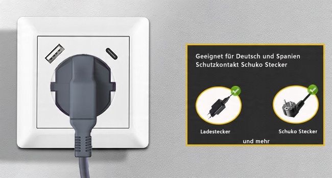 【Практический USB C】 Type C】: Schuko Socket с 1 USB -разъемом и 1 портом типа C. Он предлагает 2 различных вариантов USB -оборудования. Он может заряжать 3 устройства одновременно