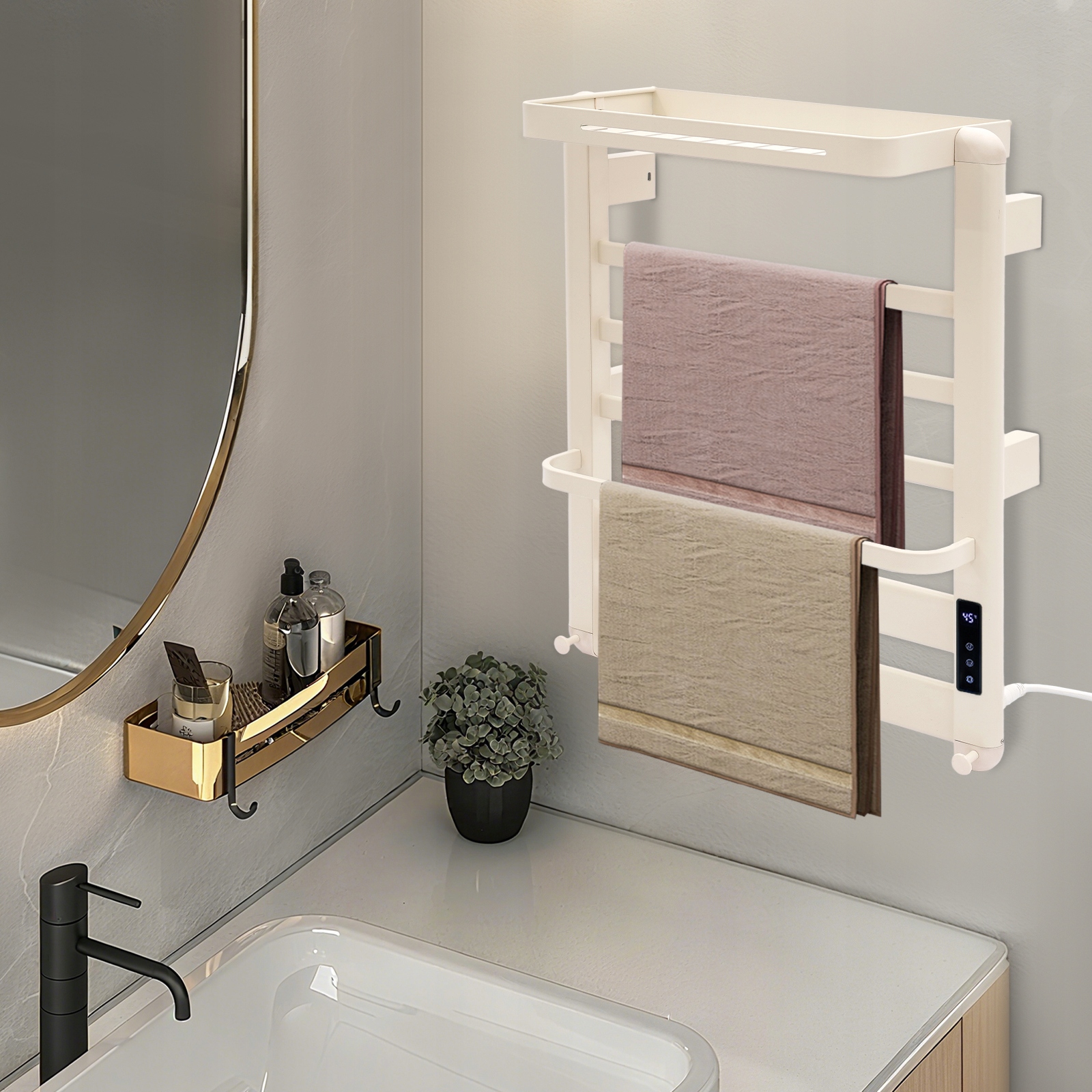 - Исключительная ценность: Эта электрическая вешалка для полотенец большой вместимости не только сохраняет ваши полотенца теплыми и уютными зимой, но также предлагает удобное место, чтобы их аккуратно повесить. Верхнюю полку можно использовать для размещения диффузора или других необходимых аксессуаров для ванной комнаты.