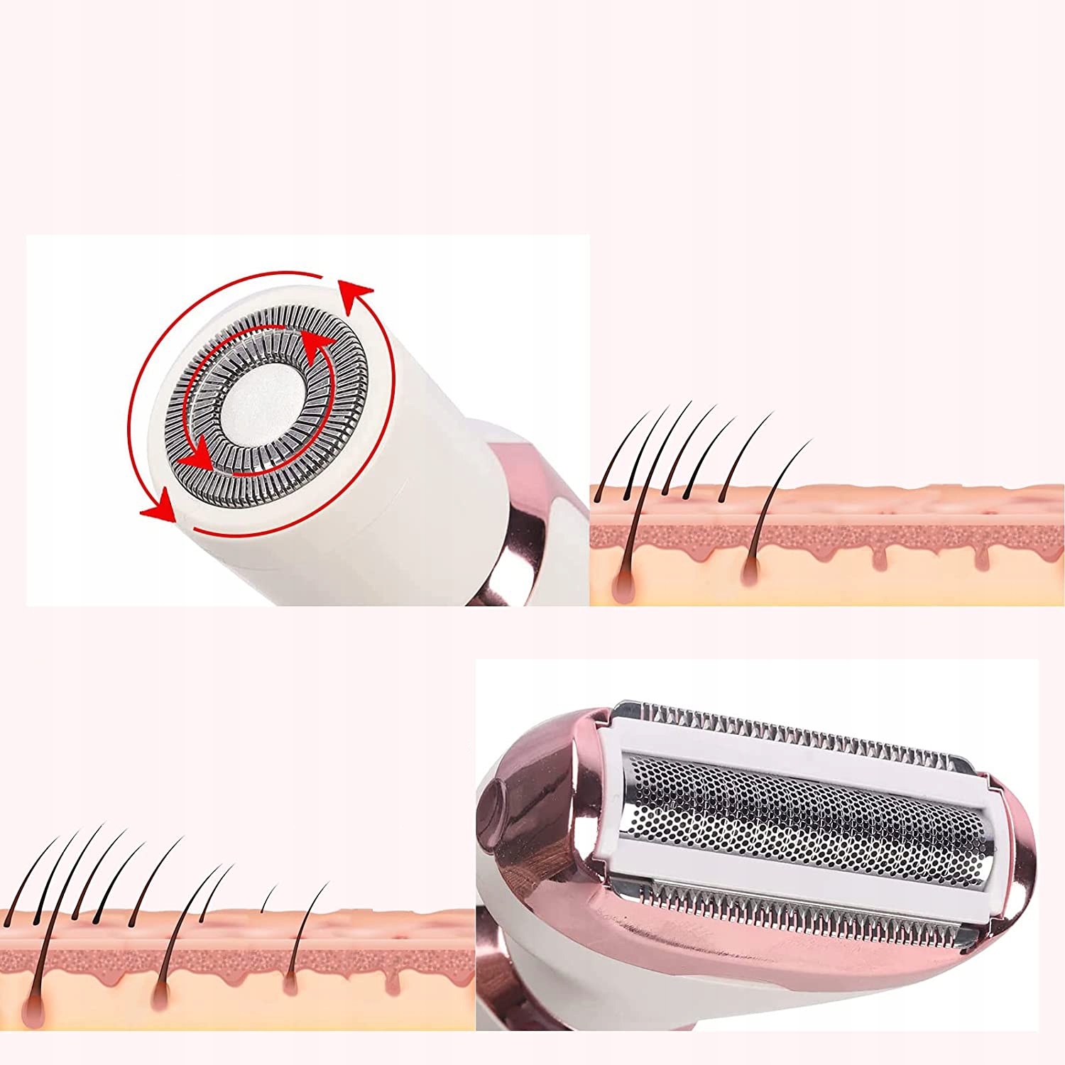 В комплект электробритвы 4 в 1 входят 4 многофункциональных устройства. суставы, способные мгновенно удалить волосы с лица, рук, ног, линии бикини, носа, бровей и других участков, разглаживая кожу.