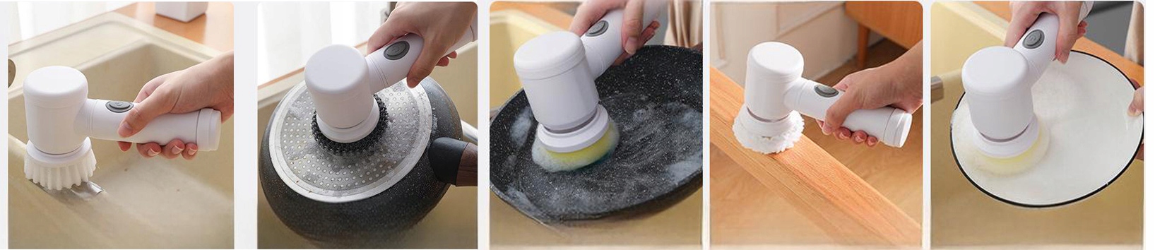 Моторизованный роторный скруббер оснащен 6 сменными высококачественными щеточными насадками, которые отвечают различным требованиям в разных ситуациях. Их можно сделать прозрачными для чистки ванных комнат, кухонь, грилей, кухонных столешниц, твердых жирных стен, щелей, раковин, полок, цементного раствора, ванн, унитазов, колес, полов, стекла, окон, посуды и т. д. Ручка для хранения обеспечивает легкий доступ к щетке.