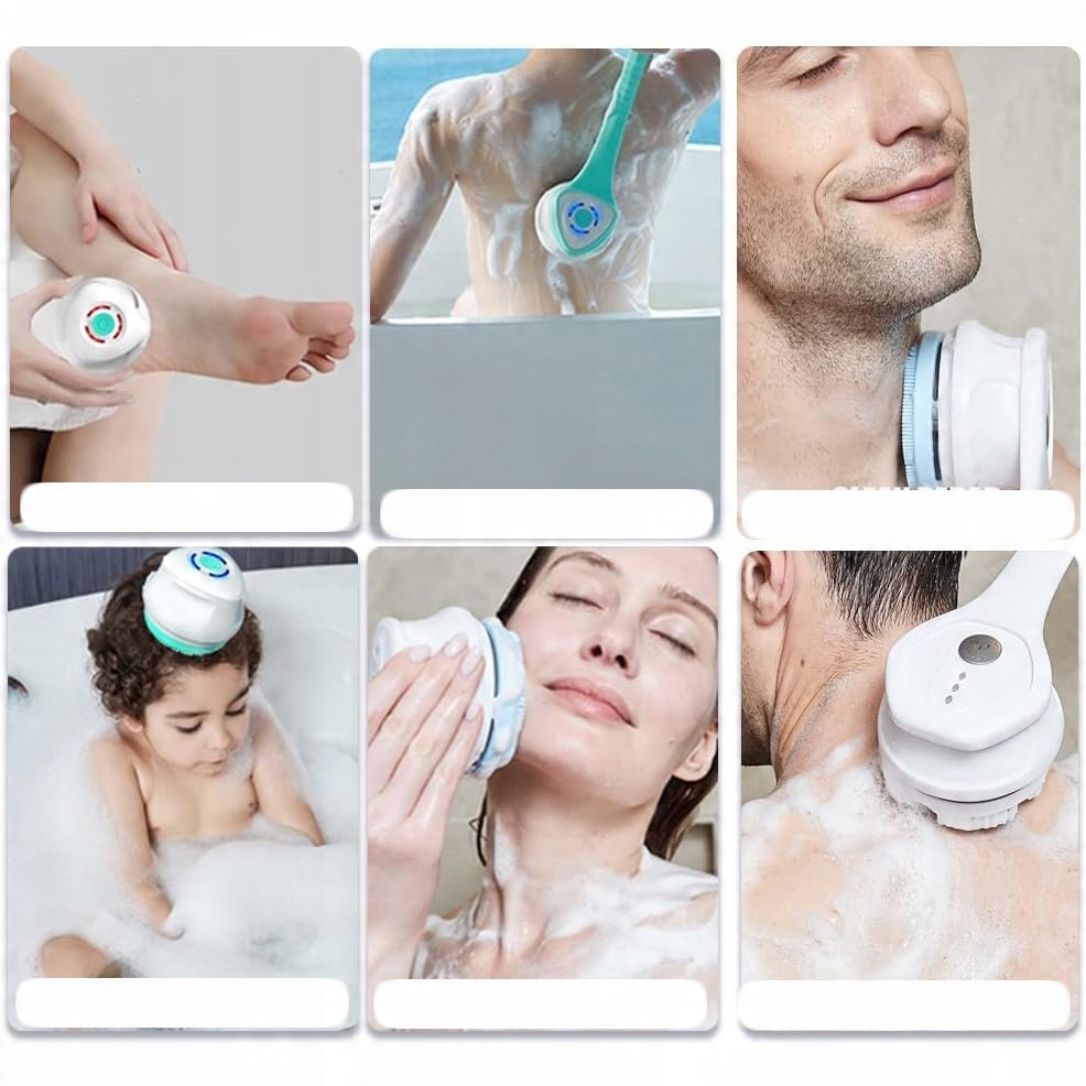 🛁 【Состав】 Электрическая щетка для тела состоит из трех частей: ручки, основного блока и головки массажной щетки. Уникальная концепция дизайна позволяет легко и удобно заменять насадку щетки. Пять разных массажных головок подходят для разных людей.