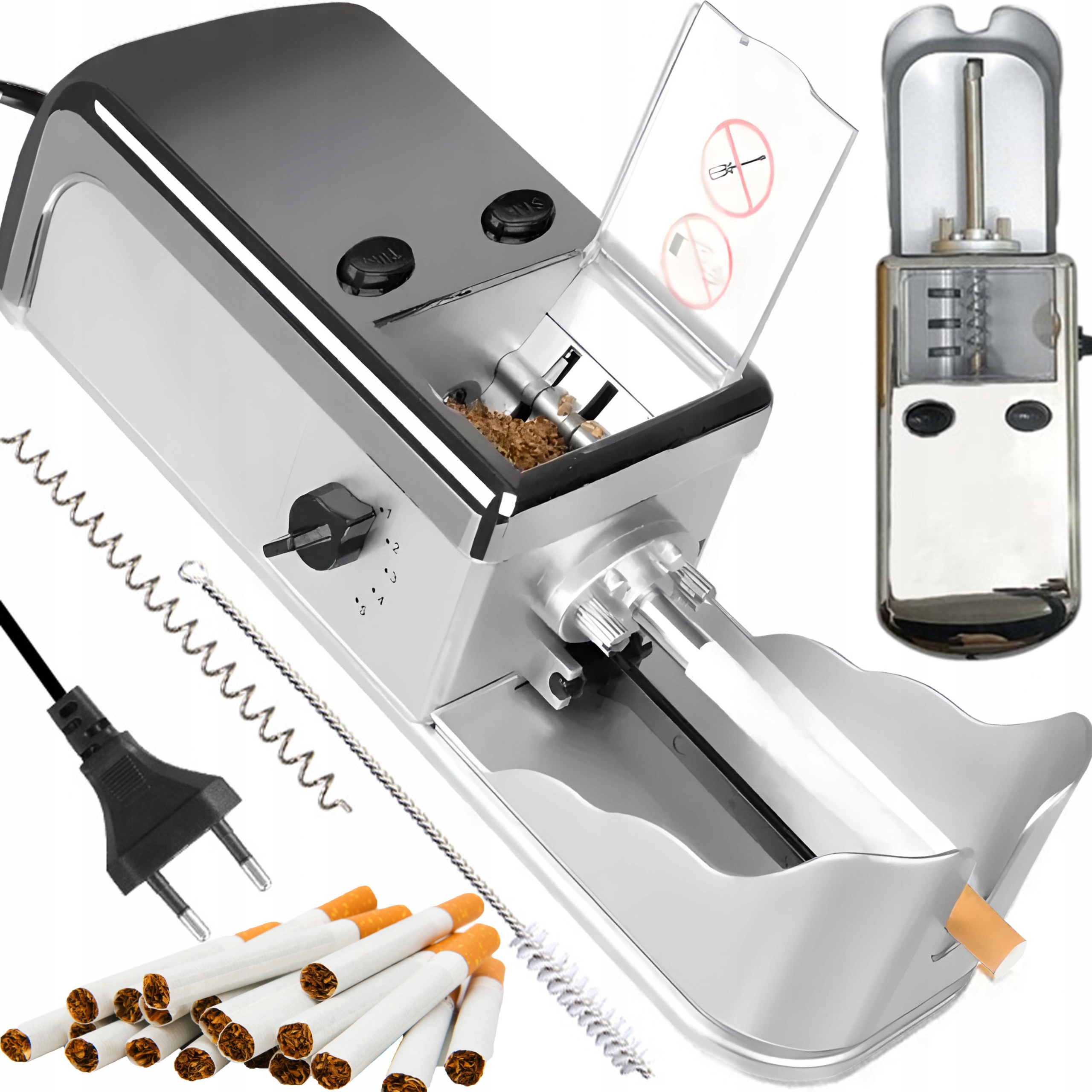 Электрический наполнитель для сигарет — устройство, позволяющее засыпать табак в сигареты с помощью электрического механизма. Наполнитель очень прост в использовании. Все, что вам нужно сделать, это нажать на ручку под направляющей, вставить трубку, наполнить контейнер табаком, выставить плотность наполнения трубки с помощью ручки, нажать кнопку на автомате и ваша сигарета готова.
