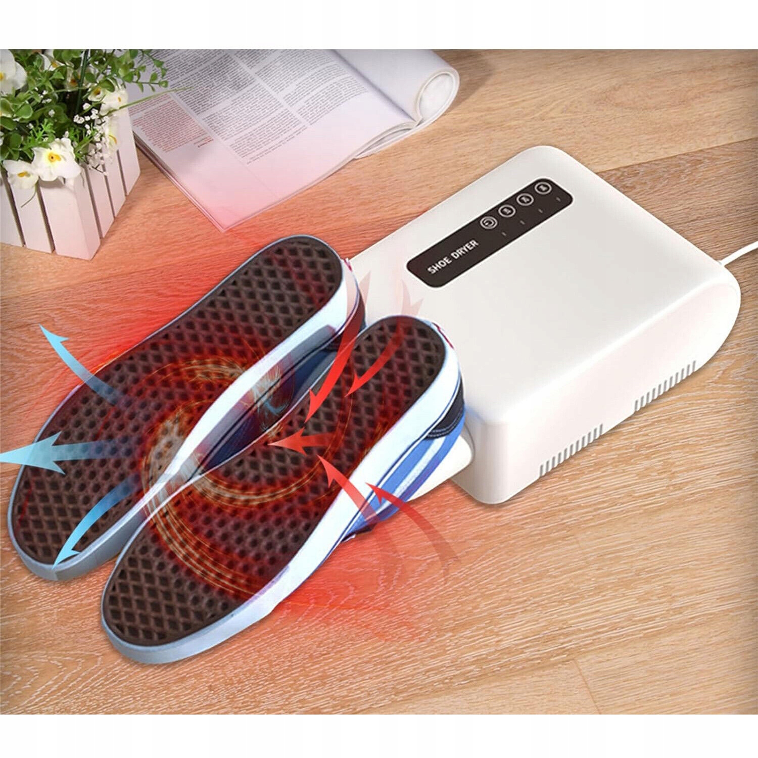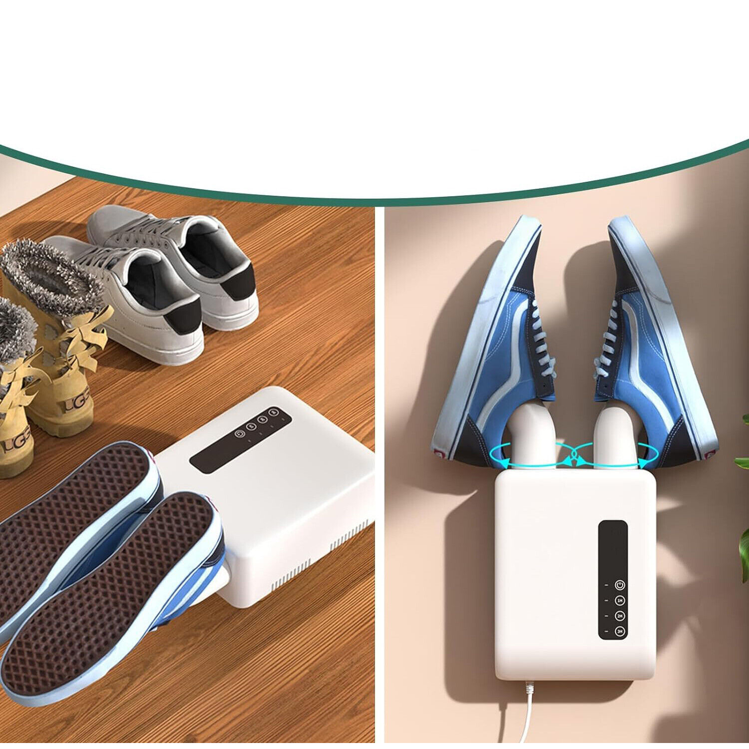 Сушилка для обуви была спроектирована с внутренним циркуляцией горячего воздуха, чтобы быстро и эффективно высушить обувь, быстро удаляя влагу и заботясь о обуви, а постоянный контроль температуры гарантирует, что обувь не будет повреждена. Это также может предотвратить бактериальное разведение во влажной среде. Встроенная функция дезинфекции и дезодоризации не только устраняет неприятные запахи, но также сохраняет обувь чистой и гигиеной.