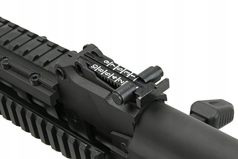 Пистолет изготовлен из металла и АБС-пластика черного матового цвета. Корпус оружия выполнен из металла. Пистолетная рукоятка и приклад типа SF изготовлены из АБС-пластика. Место для хранения аккумулятора находится на складе. Приклад телескопический и регулируется по длине. На оружии имеется металлическая RIS-рейка, на которую можно установить различные типы оптики или тактический фонарь. На правой стороне оружия имеется переключатель предохранителя и огня. Наружный ствол оснащен левым глушителем диаметром 14 мм. Оружие имеет мехабокс V.3 с усиленной рамой, подшипниками диаметром 7 мм и усиленным поршнем. Оружие имеет пластиковый магазин ABS Hi-Cap P-MAG емкостью 500 патронов.