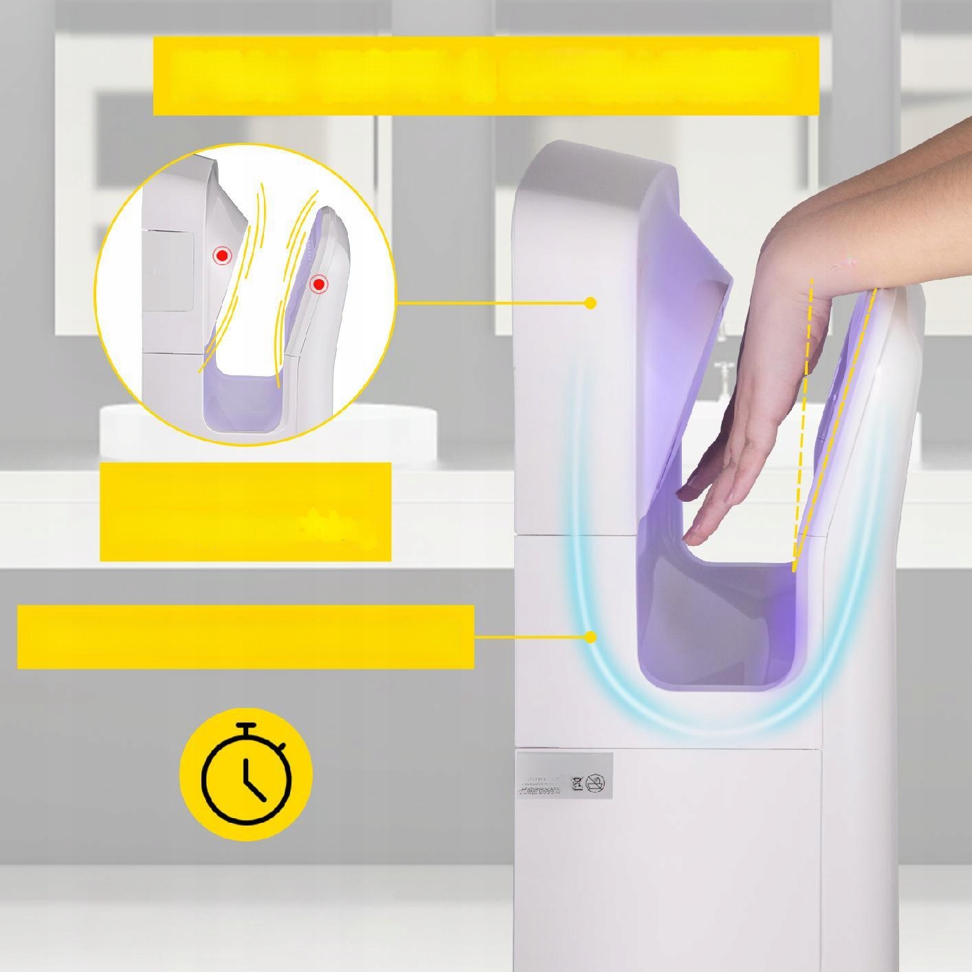 Современная электрическая сушилка для рук с 2000 Вт, оснащенную системой быстрой сушилки и фильтрацией HEPA. Благодаря двигателю скорости 23000 об/мин, сушка рук длится только 8-10 секунд . Бесконтактная работа, твердое корпус с ABS и возможность установить температуру воздуха, что делает его идеальным решением для общественных и коммерческих мест.