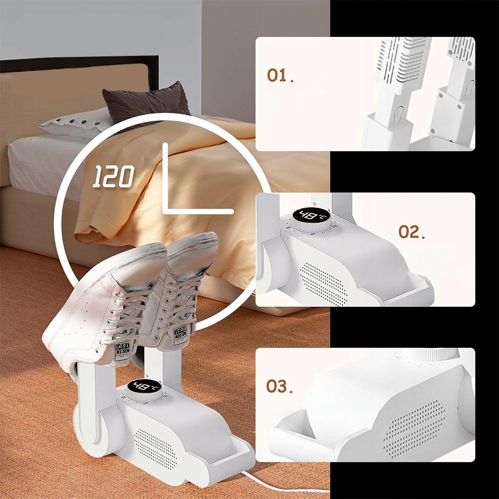 🥾Для обуви из разных материалов, разной толщины и с разным уровнем влажности таймер можно установить до 120 минут.