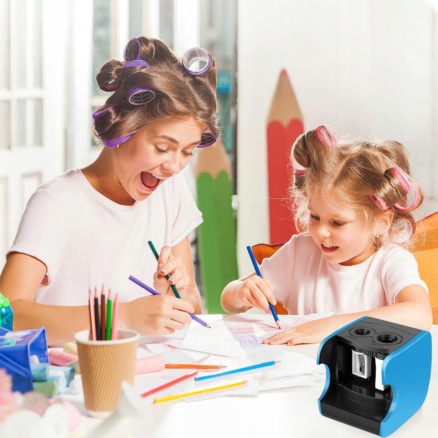 Наша электрическая точилка доступна в двух размерах (диаметр 6-8 мм и 9-12 мм) и подходит для различных типов карандашей, например, толстых карандашных мелков и других крупных карандаши, а также для тонких карандашей стандартного размера. Изделие содержит 4 сменных лезвия, без необходимости приобретать дополнительные аксессуары.