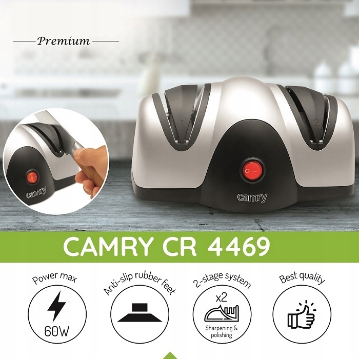 Практическая электрическая точилка для ножей AD4469 от CAMRY для заточки и полировки ножей. Благодаря такому сочетанию вам больше не нужно покупать две точилки – достаточно одной с двумя функциями, что делает ножи исключительно острыми, облегчая работу на кухне.
