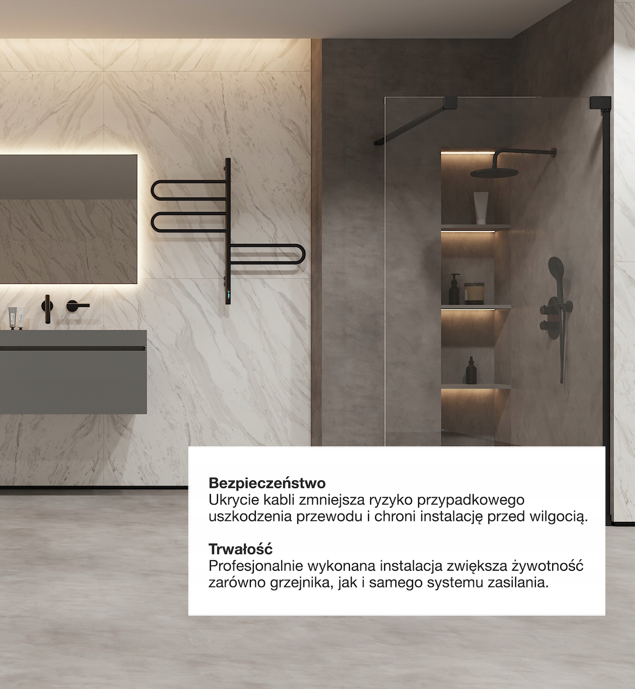 Благодаря современной технологии скрытого скрытого монтажа, вы установите электрическую сушилку для ванной комнаты Elna, без подъема питания, висящего снаружи, соединяя кабель, выступающий от радиатора прямо к кабелям электрической установки, оставляя стену. Это решение сводит к минимуму любые возможные опасные действия, связанные с использованием электрических устройств в комнатах с высоким уровнем влажности.