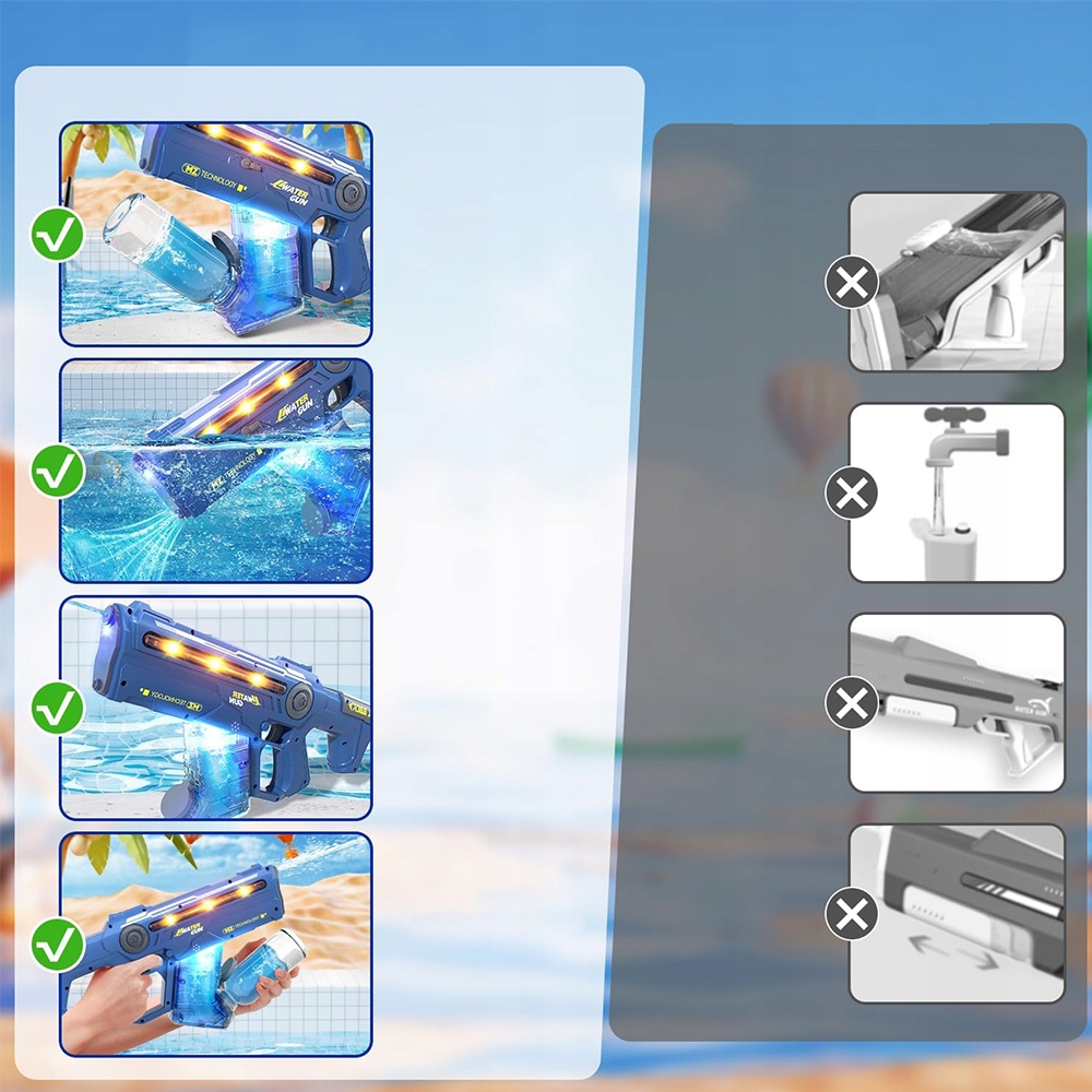 ⭐⭐ Электрический водяной пистолет оснащен светом корпуса оружия и выходным светом. Желтый свет движется с прогрессом распыления воды, благодаря которой водяной пистолет более интересен. Легкая конструкция водяного пистолета особенно является глазом, что может сразу привлечь внимание детей и заставить их любить его p>