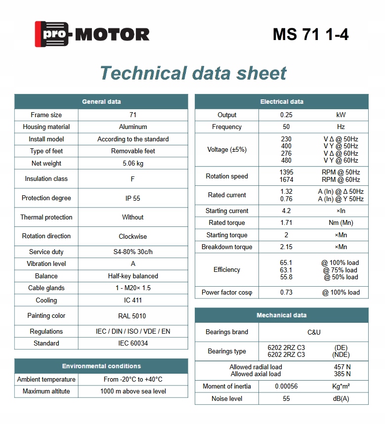 Электрическая электрическая среда MS 0,25 кВт 1400 об / мин. 71 B3