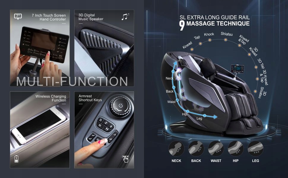 ✅【МНОГОФУНКЦИОНАЛЬНОЕ, НО БЫСТРОЕ УПРАВЛЕНИЕ】Легкодоступная панель управления расположена на правом подлокотнике, а многофункциональный пульт дистанционного управления с ЖК-дисплеем для вашего удобства прикреплен к левому подлокотнику. Бесступенчатая регулировка наклона спинки. Расслабьтесь и слушайте музыку через Bluetooth. Встроенные динамики позволяют слушать музыку с телефона через Bluetooth во время массажа. Система голосового управления обеспечивает комплексную и быструю работу.