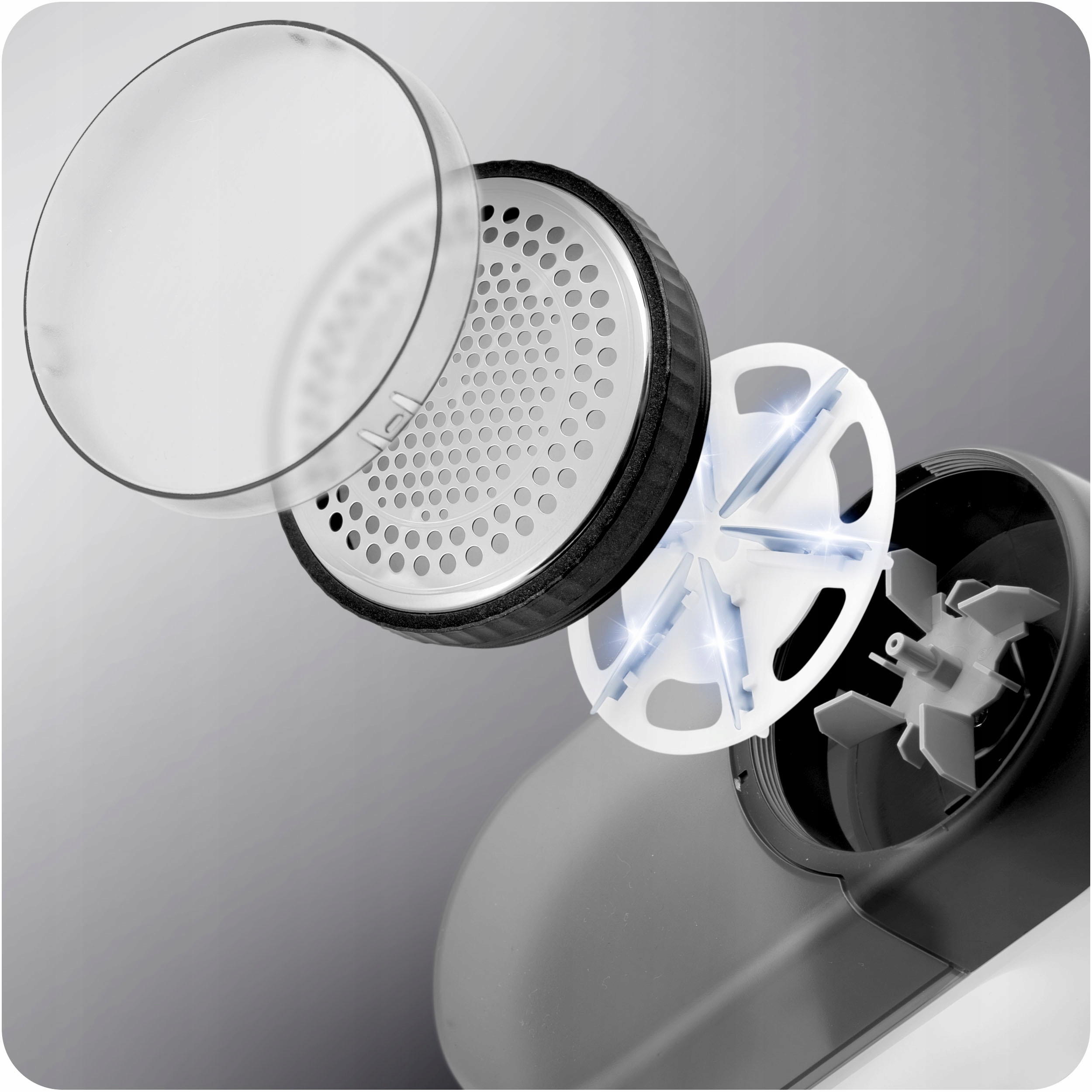 - 6 лезвий из нержавеющей стали обеспечивают точное и эффективное удаление пух, облаков, выступающих нитей и тканевых шариков.
