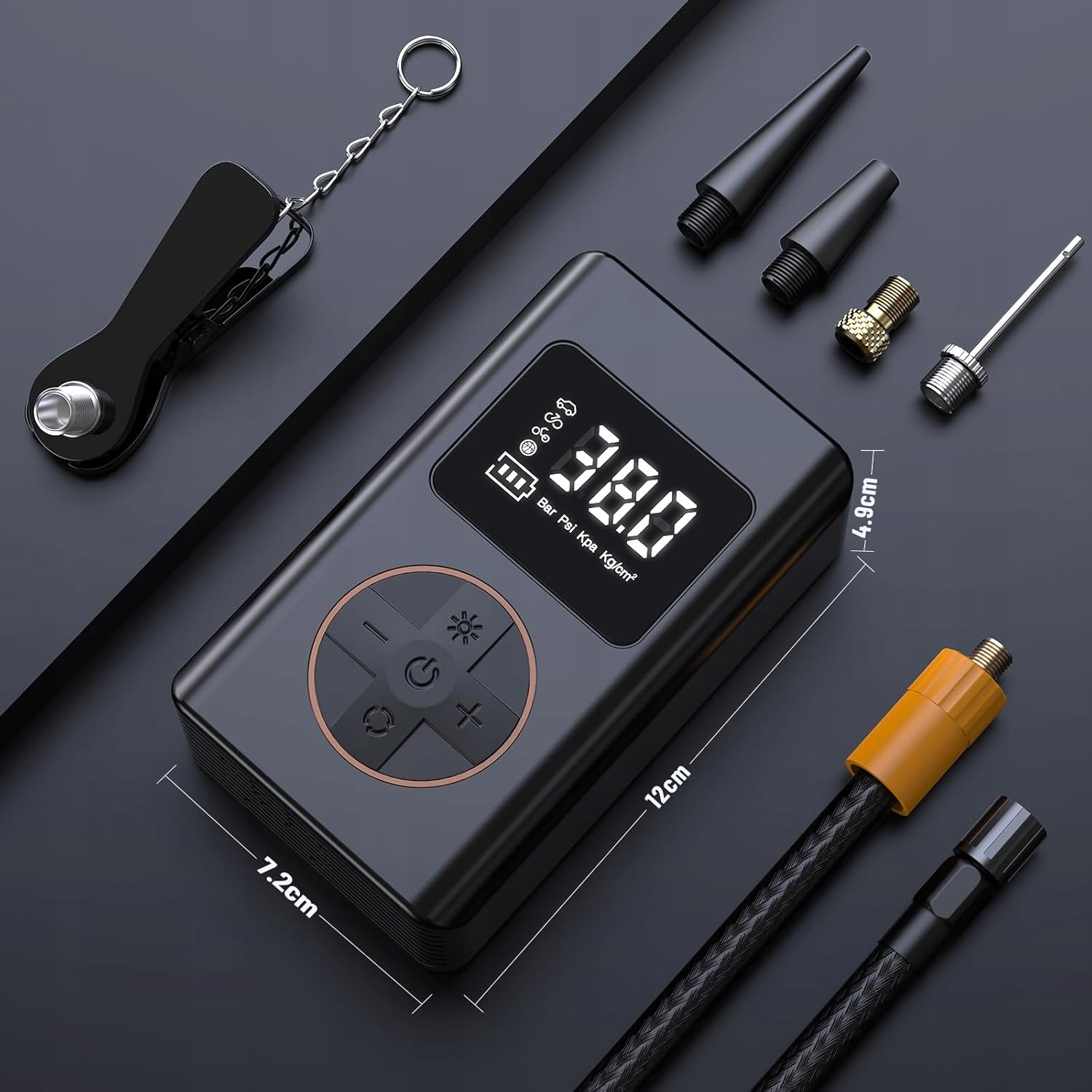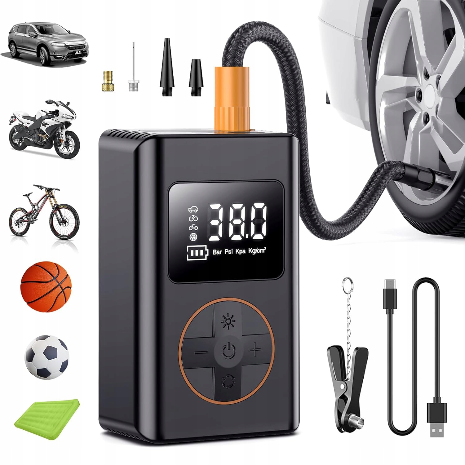- Наш электрический воздушный насос оснащен сильной батареей с емкостью 3600 мАч, поэтому вам не нужно беспокоиться о том, что при повторном наполнении шин аккумулятор исчерпает. 2 режима (нормальные/мигающие), он может работать очень четко даже ночью. Функция запрограммированного давления в шинах, установленное значение автоматически останавливается, помогая избежать чрезмерного давления в шинах и освободить руки.