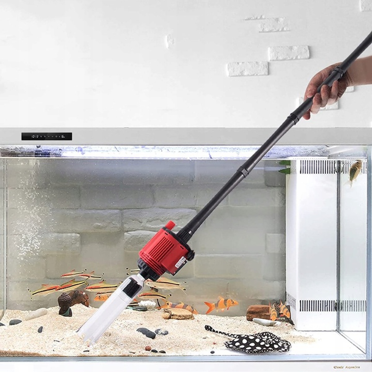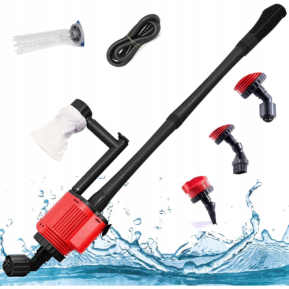 - Очиститель аквариума со сменой воды, очистителем песка, очистителем от рыбного мусора, водным фильтром, водяным душем и потоком воды 6 в 1. При работе с другой функцией его следует подключить к другой вилке. Гравийный фильтр на присоске предотвращает засасывание мелкой рыбы или крабов. Подходит для больших и малых аквариумов, панцирей черепах, пресной и соленой воды. Комплект для чистки