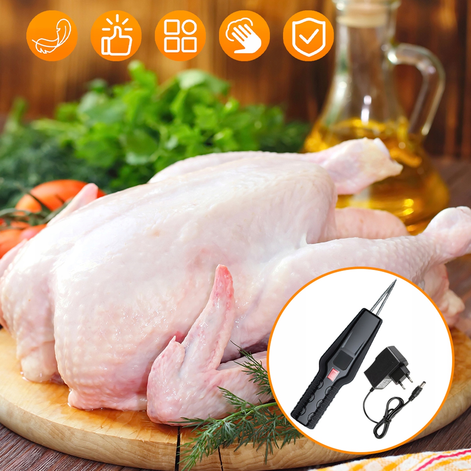 Мощный двигатель работает со скоростью 240 об/мин, удаляя перья всего за несколько минут. Простое управление, экономия времени и усилий!