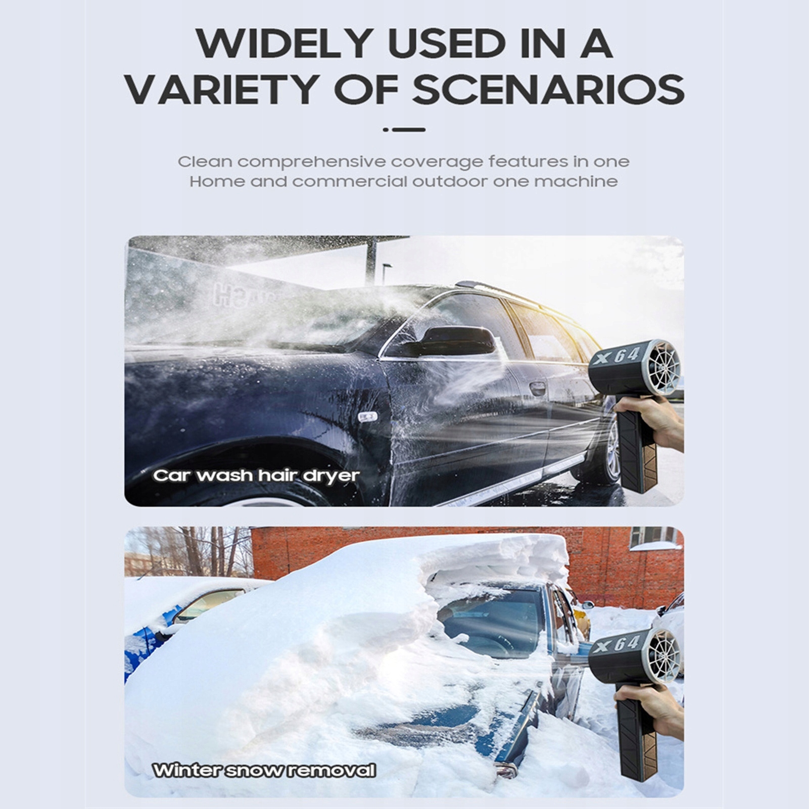 5. Универсальное использование: подходит для различных задач по уборке, таких как уборка снега, надувание матрасов, подметание дворов, чистка клавиатур, мытье автомобилей и мотоциклов, очистка щелей, удаление крошек с ковриков и многое другое. Этот воздуходувный вентилятор идеально подходит как для домашнего использования, так и для коммерческого использования на открытом воздухе.