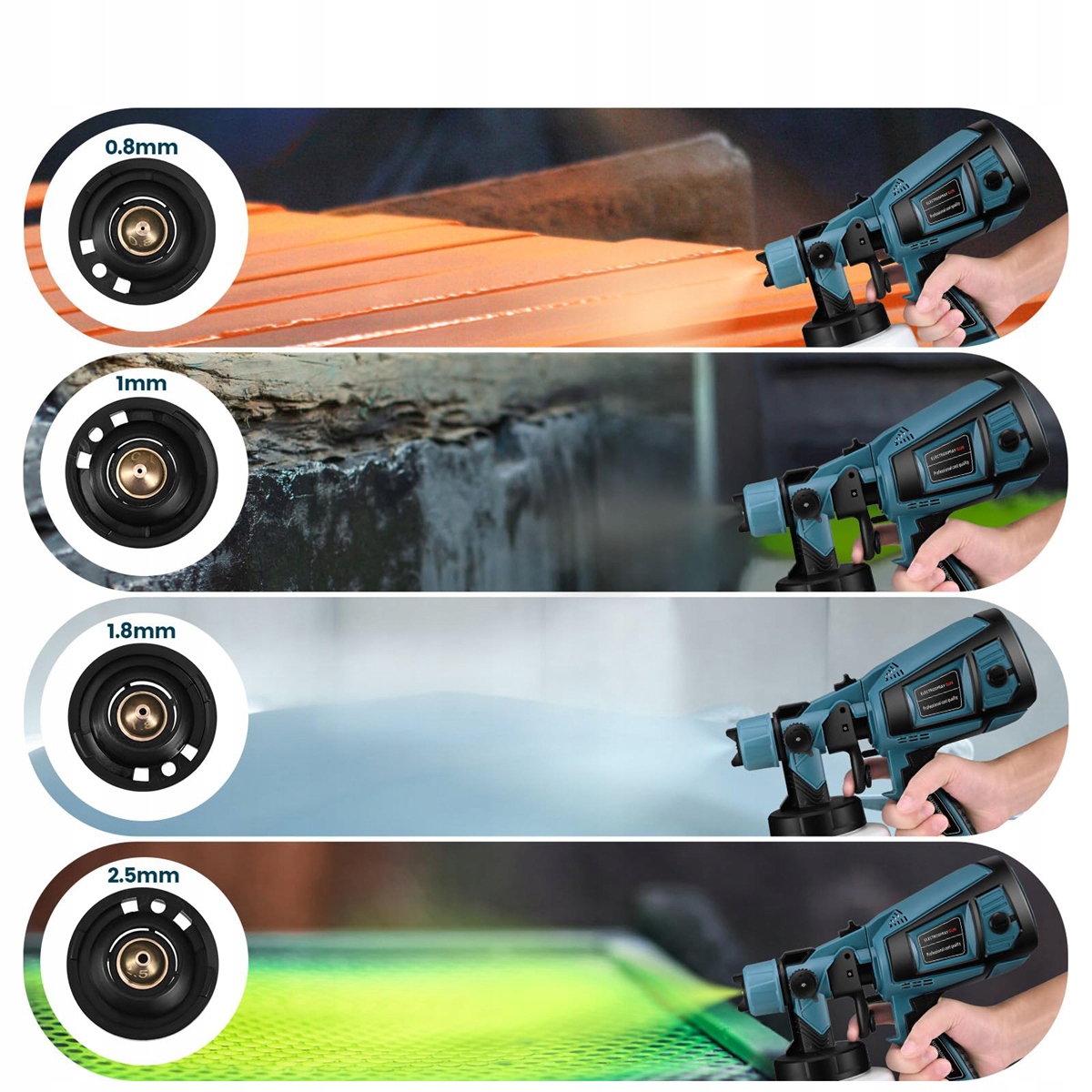 Он поставляется с 4 сменными медными соплами (0,8 мм/1 мм/1,8 мм/2,5 мм) для распыление различных материалов.