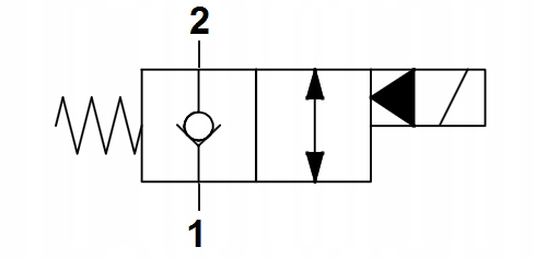 Клапан нормально закрытый, в бестоковом режиме поток заблокирован от 2 до 1 и свободен от 1 до 2. После подачи тока поток свободен в обоих направления.