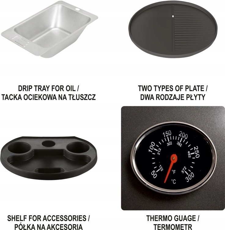 - два типа тарелок - половина пластина плоская, половина рифленая. Канал посередине облегчает слив жира в поддон для сбора капель.