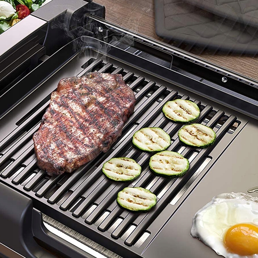 Мощность GRT801 составляет 2200 Вт, благодаря чему гриль очень быстро нагревается, обеспечивая высокую эффективность работы. Стеклянная крышка помогает поддерживать и контролировать высокую температуру, а также предотвращает попадание жира на мебель. Съемная нагревательная пластина размерами 39 х 29 см покрыта антипригарным покрытием без ПФОК, что гарантирует, что наша посуда будет безопасна для здоровья, не подгорит и не прилипнет во время приготовления на гриле, из-за чего она часто разваливается.< /п>