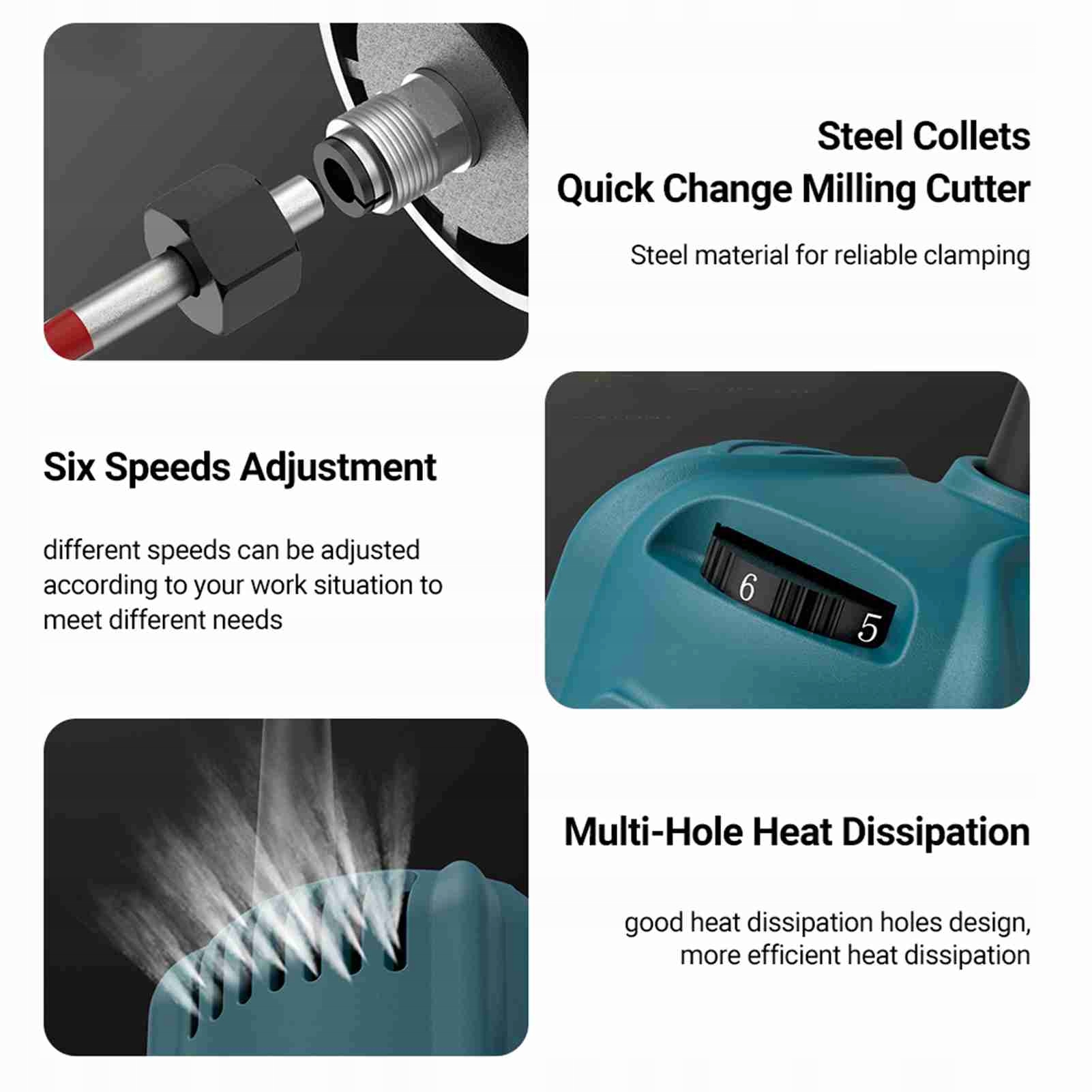 2. [Мощный двигатель 800 Вт] Компактный фрезерный станок по дереву оснащен мощным двигателем мощностью 800 Вт, который поддерживает 6 регулируемых скоростей с максимальной скоростью 33000 об/мин.
