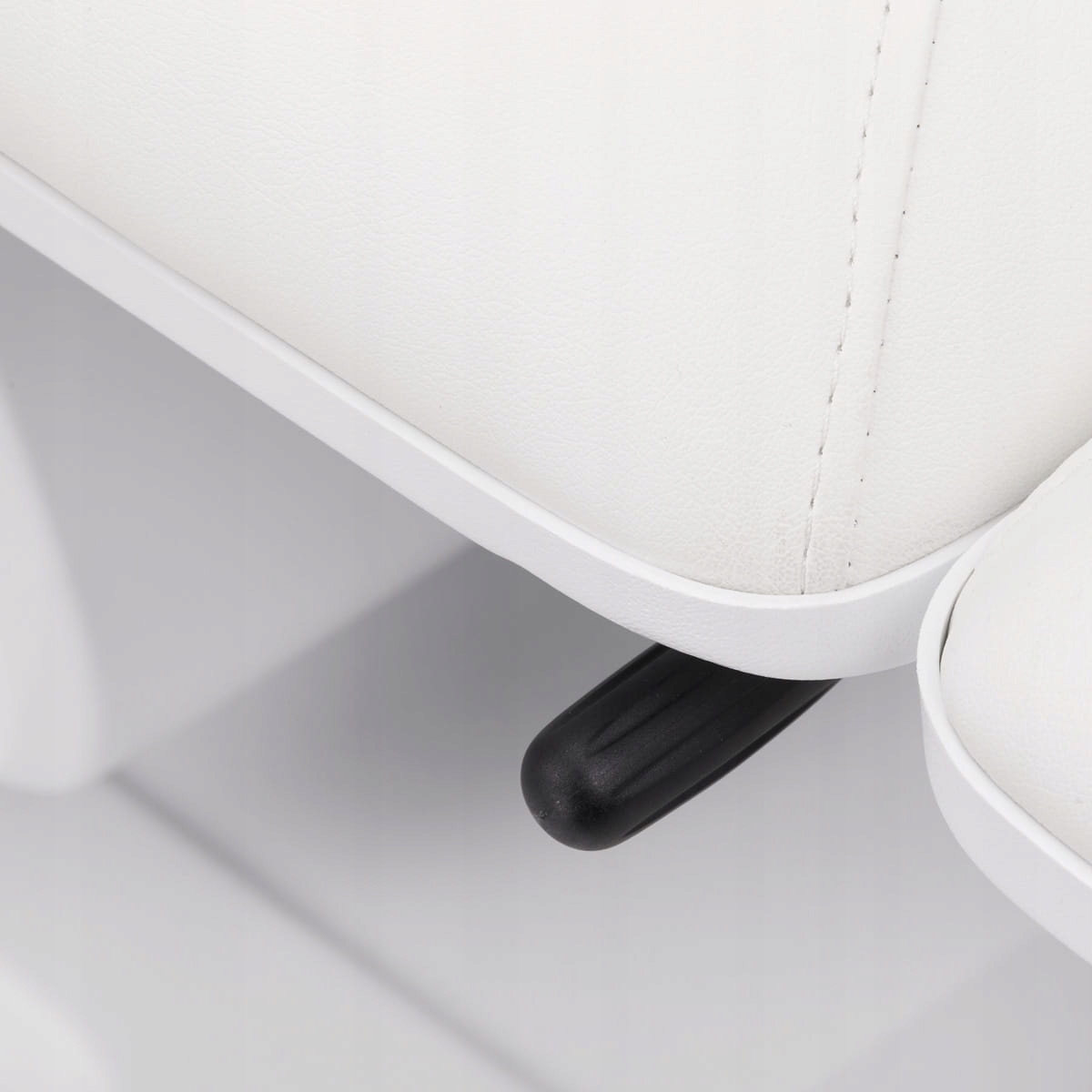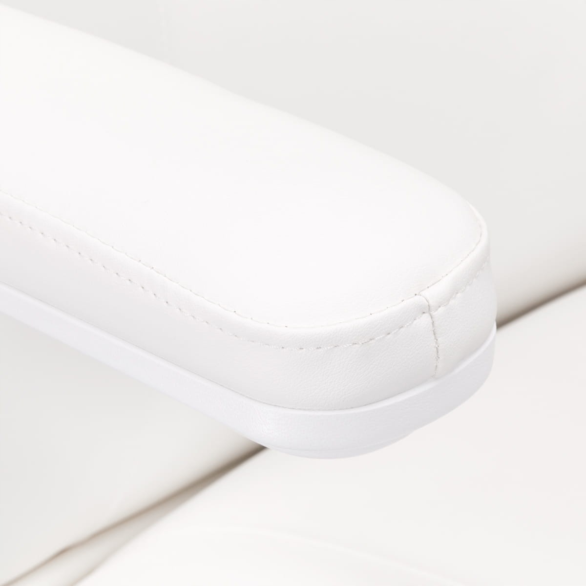 Кресло наполнено поролоном и обтянуто приятной на ощупь матовой искусственной кожей белого оттенка. Благодаря использованию такого материала оборудование устойчиво к влаге и легко чистится.