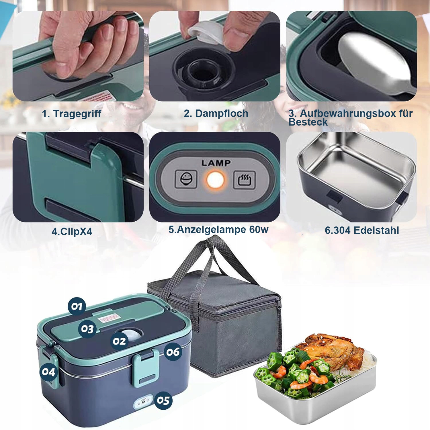 ЭЛЕКТРИЧЕСКИЙ ЛАНЧ-БОКС В КАРКАСНОМ ТИЛЕ С ЕВРОПЕЙСКОЙ ВИЛКОЙ СИНИЙ/ЗЕЛЕНЫЙ НАГРЕВАТЕЛЬ ДЛЯ ПИЩИ 1,8 Л