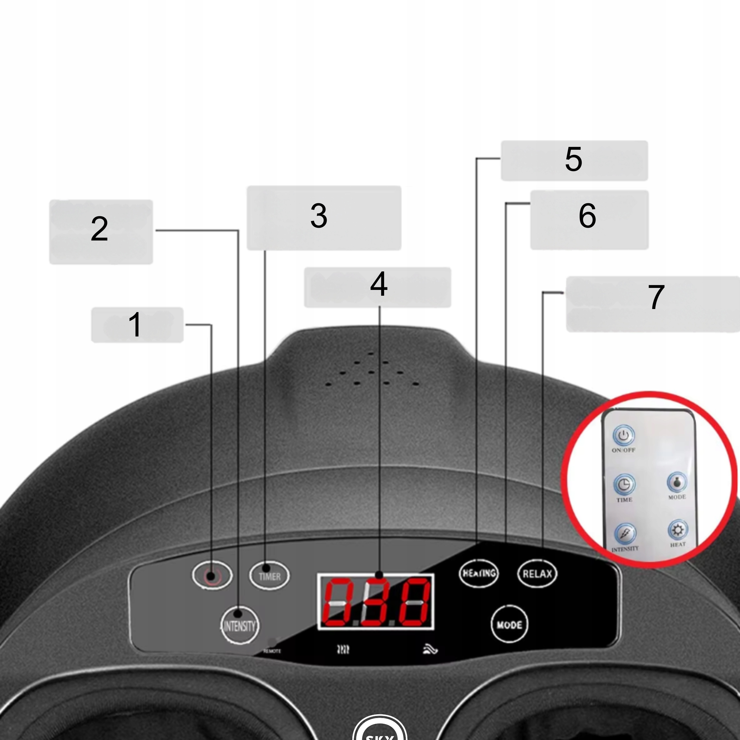 5⃣ Кнопка отопления (отопление) - активирует функцию нагрева, которая улучшает кровообращение и обеспечивает дополнительные релаксационные ноги